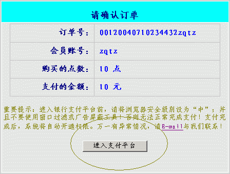 【注意】:进行网上银行支付、声讯电话支付、手机短信支付时,除了将浏览器安全级别设为“中”,Cookie设为“中高”外,请务必使用windows自带的IE浏览器,而不要使用MyIe等变种浏览器!一是因为一些网上银行系统只支持IE;二是因为MyIe等变种浏览器往往带有窗口过滤或广告屏蔽功能,这可能屏蔽数据返回页面而造成支付失败! |