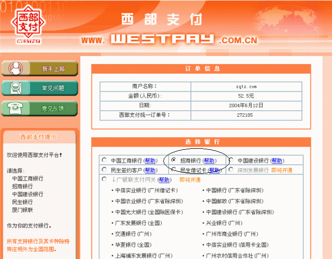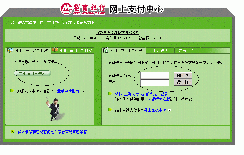 第六步:进入银行支付界面(以招行为例,其它银行类似)